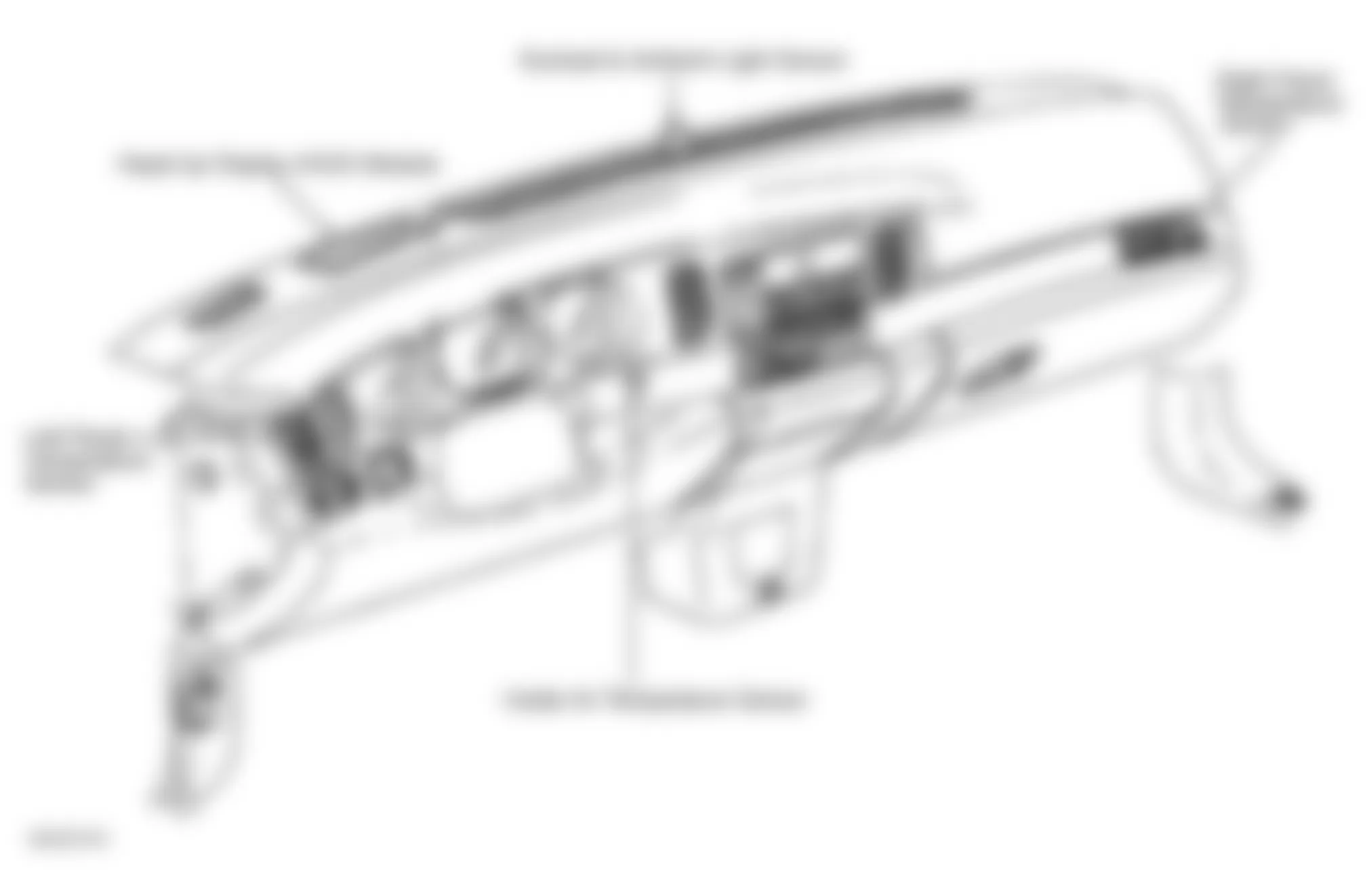 Component Location A/C Pressure Sensor Behind A/C compressor, on A/C line. Ambient Outside Air Temperature Sensor On hood latch support. Automatic Level Control Height Sensor Under rear of vehicle, near rear suspension. Camshaft Position (CMP) Sensor (3.8L VIN K) On front of engine, below water pump. See Fig. 2 . Camshaft Position (CMP) Sensor (3.8L VIN 1) On front of engine, below water pump. See Fig. 5 . Crankshaft Position (CKP) Sensor (3.8L VIN K) On front of engine, behind crank pulley. See Fig. 2 . Crankshaft Position (CKP) Sensor (3.8L VIN 1) On front of engine, behind crank pulley. See Fig. 5 . Driver Inflatable Restraint Side Impact Sensor (SIS) At base of left "B" pillar, behind trim panel. Engine Coolant Level Sensor (Buick) On radiator right tank. Engine Coolant Level Sensor (Pontiac) On radiator left tank. Engine Coolant Temperature (ECT) Sensor (3.8L VIN K) On rear of engine, near thermostat housing. See Fig. 2 . Engine Coolant Temperature (ECT) Sensor (3.8L VIN 1) On rear of engine, near thermostat housing. See Fig. 5 . Fuel Sender On top of fuel tank. Fuel Tank Pressure Sensor On top of fuel tank. Heated Oxygen Sensor (HO2S) Bank 1 Sensor 1 (3.8L VIN K) In right exhaust manifold. See Fig. 1 . Heated Oxygen Sensor (HO2S) Bank 1 Sensor 1 (3.8L VIN 1) In right exhaust manifold. See Fig. 4 . Heated Oxygen Sensor (HO2S) Bank 1 Sensor 2 (3.8L VIN K) Near rear of catalytic converter. Heated Oxygen Sensor (HO2S) Bank 1 Sensor 2 (3.8L VIN 1) Near rear of catalytic converter. Inside Air Temperature Sensor Near left center dash panel vent. See Fig. 8 . Intake Air Temperature (IAT) Sensor (3.8L VIN K) On left side of engine compartment, in air intake duct. See Fig. 3 . Intake Air Temperature (IAT) Sensor (3.8L VIN 1) On left side of engine compartment, in air intake duct. Knock Sensor (KS) Bank 1 (3.8L VIN K) On lower front of engine block, near starter. Knock Sensor (KS) Bank 1 (3.8L VIN 1) On lower front of engine block, near starter. Knock Sensor (KS) Bank 2 (3.8L VIN K) On lower rear of engine block, near oil filter. See Fig. 1 . Knock Sensor (KS) Bank 2 (3.8L VIN 1) On lower rear of engine block, near oil filter. Lateral Accelerometer Sensor Under left rear seat. See Fig. 10 . Left Heater Temperature Sensor Under left side of dash, in sound insulator. Left Panel Temperature Sensor In left dash duct, behind outer vent. See Fig. 8 . Lower Left Air Temperature Sensor Behind left dash air discharge vent. Lower Right Air Temperature Sensor Behind right dash air discharge vent. Manifold Absolute Pressure (MAP) Sensor (3.8L VIN K) On top front of engine, near ignition control module. See Fig. 2 . Manifold Absolute Pressure (MAP) Sensor (3.8L VIN 1) On top right side of engine, above valve cover. See Fig. 4 . Mass Airflow (MAF) Sensor (3.8L VIN K) On top of throttle body. See Fig. 3 . Mass Airflow (MAF) Sensor (3.8L VIN 1) On top of throttle body. See Fig. 5 . Outside Moisture Sensor Above inside rearview mirror. Passenger Inflatable Restraint Side Impact Sensor (SIS) At base of right "B" pillar, behind trim panel. Power Steering Pressure Sensor Near rack & pinion unit input shaft. Right Heater Temperature Sensor Under right side of dash, in sound insulator. Right Panel Temperature Sensor In right dash duct, behind outer vent. See Fig. 8 . Steering Wheel Position Sensor (SWPS) On base of steering column. Sunload & Ambient Light Sensor On top center of dash, in defroster grille. See Fig. 8 . Sunload Sensor Assembly At top center of dash. Throttle Position (TP) Sensor (3.8L VIN K) On throttle body assembly. See Fig. 2 . Throttle Position (TP) Sensor (3.8L VIN 1) On throttle body assembly. See Fig. 5 . Upper Left Air Temperature Sensor Behind left dash air discharge vent. Upper Right Air Temperature Sensor Behind right dash air discharge vent. Vehicle Speed Sensor (VSS) On right front of transaxle, below power steering pump. Wheel Speed Sensor (4) On wheel hub assembly. Yaw Rate Sensor Under rear shelf, behind lid hinge.